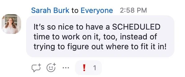 And the cool part is that the people who get it are showing up with you every single week to work on very similar things for their business. Whether they’re writing a newsletter, outlining a blog post, or working on their website, everyone is in the same boat!